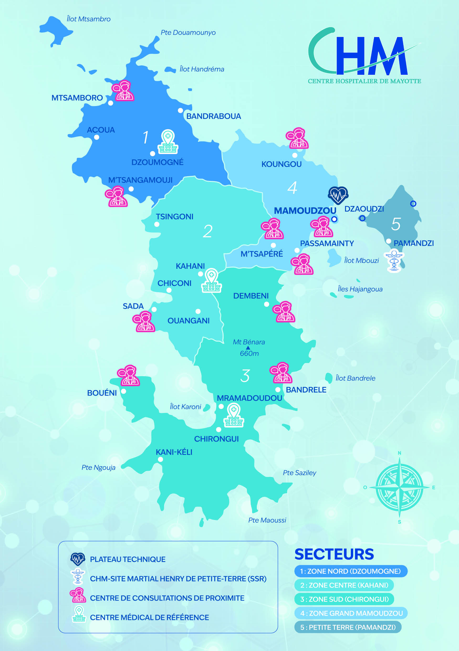 Le Centre Hospitalier de Mayotte (CHM) est le principal établissement de santé du territoire, au service d’une population jeune et en forte croissance. Avec plus de 3 100 professionnels répartis sur les activités de soins, de soutien et de logistique, le CHM garantit une offre de santé de proximité et de qualité.